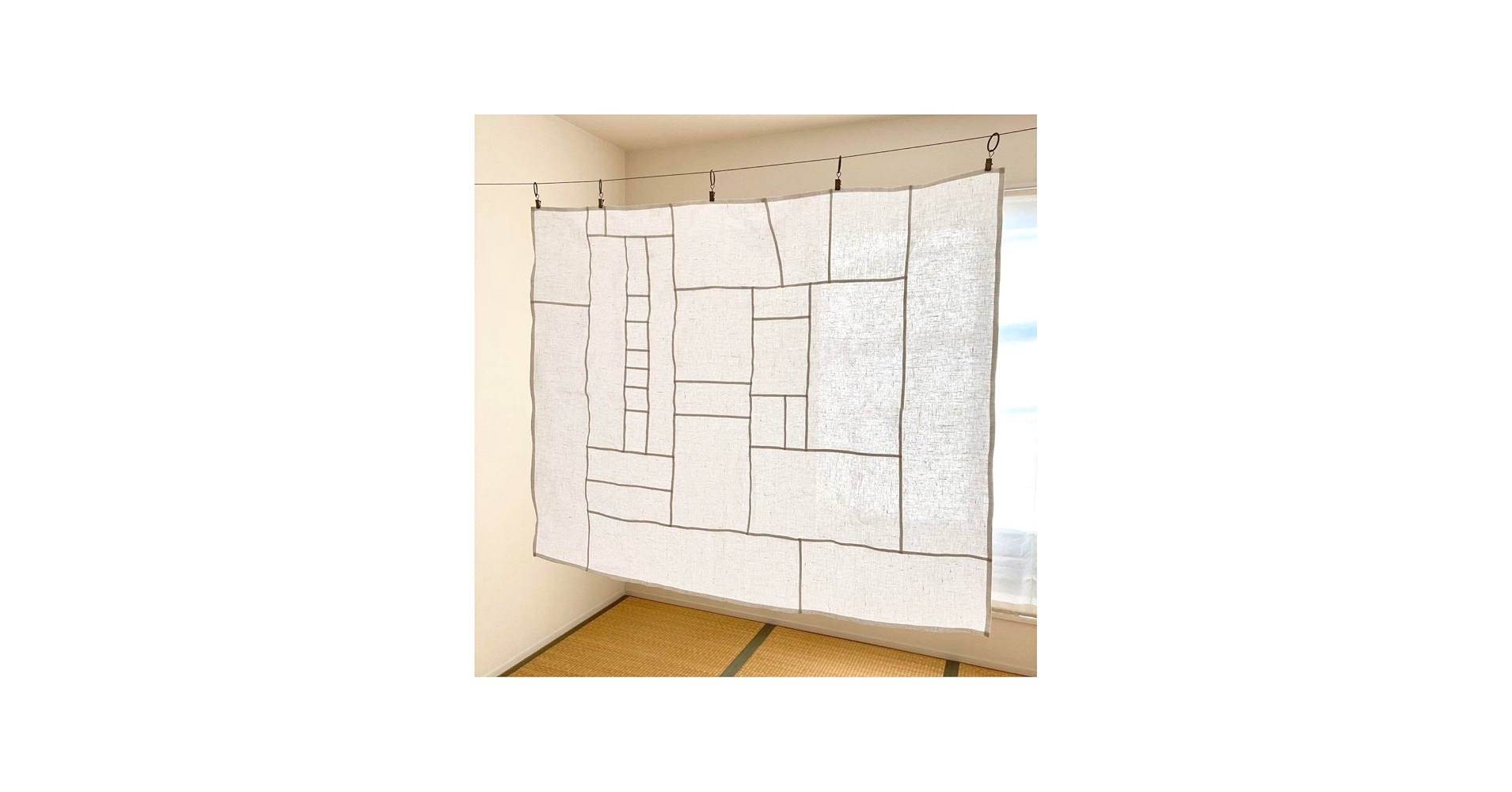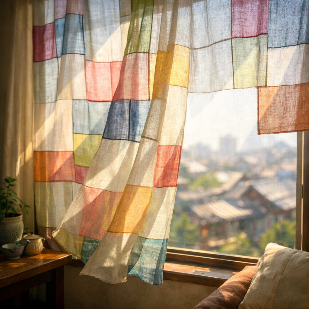 南向きの窓辺では、韓国の伝統的なパッチワークである「ポジャギ」を、カーテン代わりに吊るしている。麻の端切れを丁寧に繋ぎ合わせたその薄い布越しに、鋭角な午後の光が柔らかく濾過され、部屋の奥へと滲み込んでいく。風が少し吹くたびに、不揃いな継ぎ目がふわりと揺れ、その向こうにある街並みが、磨りガラスを通したようにぼんやりと形を変えた。
