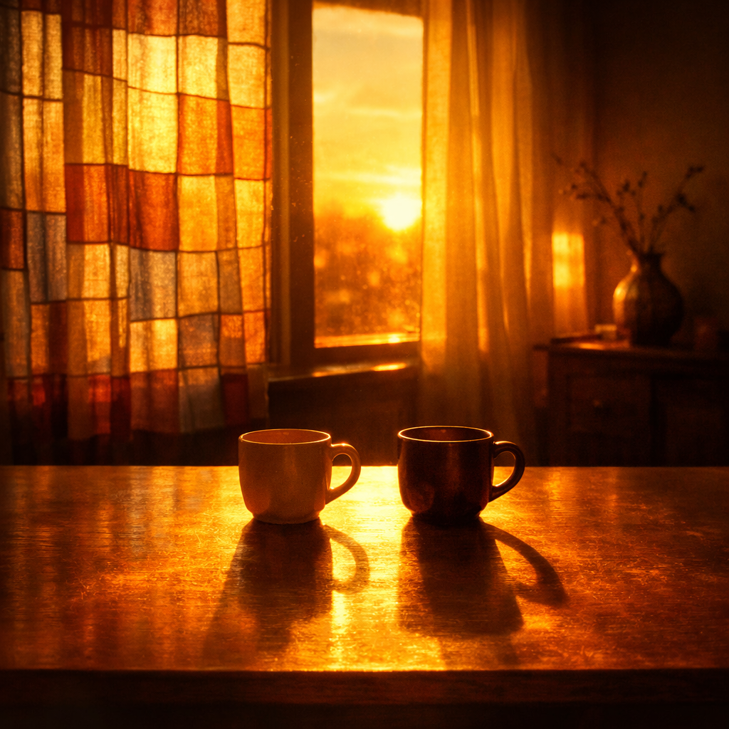 西日はポジャギの布目を鮮やかに浮き上がらせ、部屋の中をアンバー色のフィルターで覆っていく。テーブルの天板が金色に染まり、そこに置かれた二つのカップが長い影を落とす。