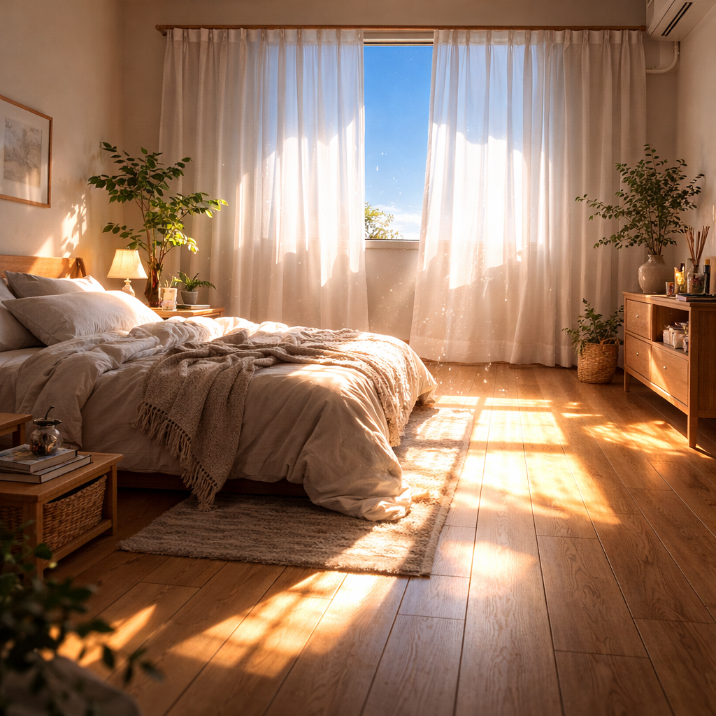 寝室のカーテンは、いつも朝日を柔らかく遮ってくれる薄手の白いレース地。そのカーテンの切れ目から、秋晴れの青空が覗いている。雲一つない、澄み切った空色。十月半ばの陽射しが斜めに差し込んで、少し(まぶ)しい。目を細めながら視線を床に移すと、フローリングの木目に、くっきりとした()()まりができていた。微細(びさい)(ほこり)が、光の筋の中でゆっくりと舞っている。