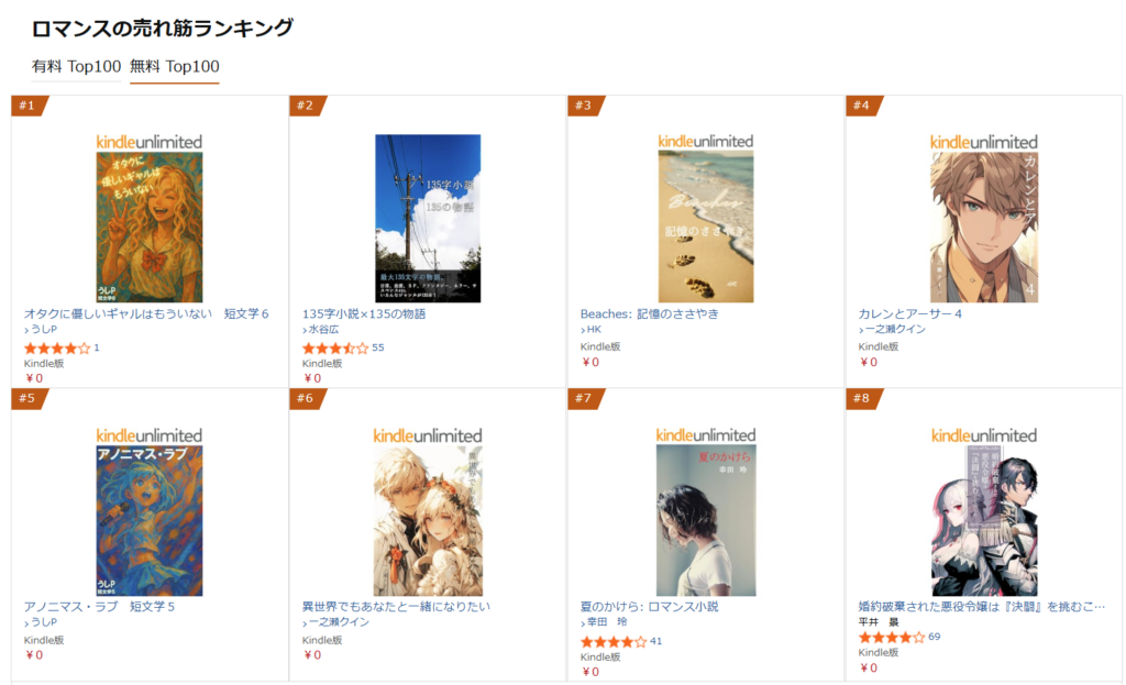 おかげさまで、「ロマンスの売れ筋無料ランキング」で、7位にランクインできました。