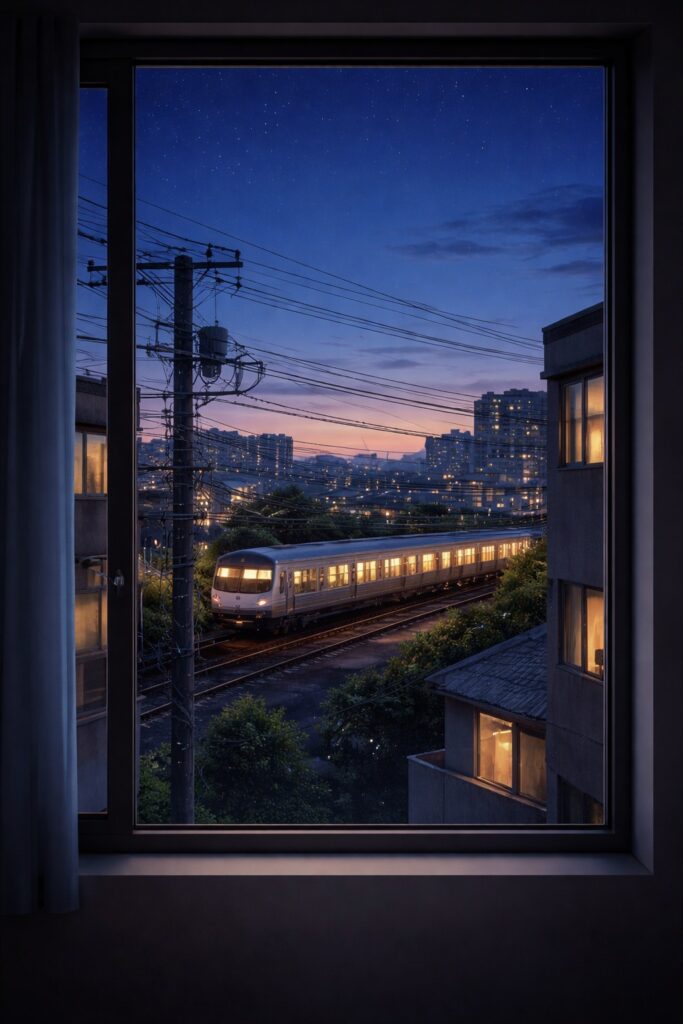 北東向きの窓の向こうには、幾層にも重なった電線と、遠くで規則正しく行き交う銀色の電車。遮るもののない高層階ではないけれど、隣接する建物の隙間から覗く空は、朝には淡いブルーに、夕刻には深い群青色へと、静かにその表情を変えていく。