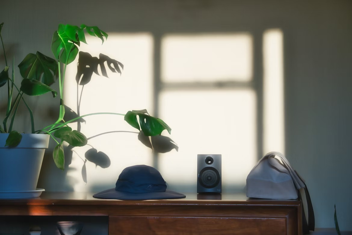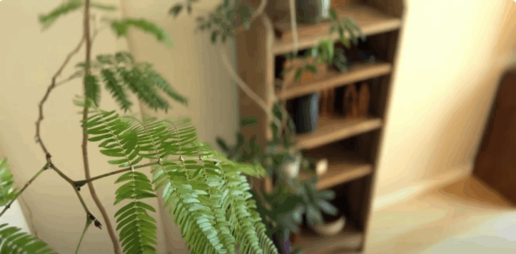 窓際にはエバーフレッシュの柔らかな葉が揺れ、円形のテーブルが陽射しを受けていた。